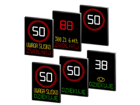 - Tak. Urządzenie prezentuje znak B-33 z obowiązującym limitem prędkości oraz spersonalizowane komunikaty, takie jak „UWAGA SZKOŁA”, „UWAGA DZIECI” czy „UWAGA ŚLISKO”.
